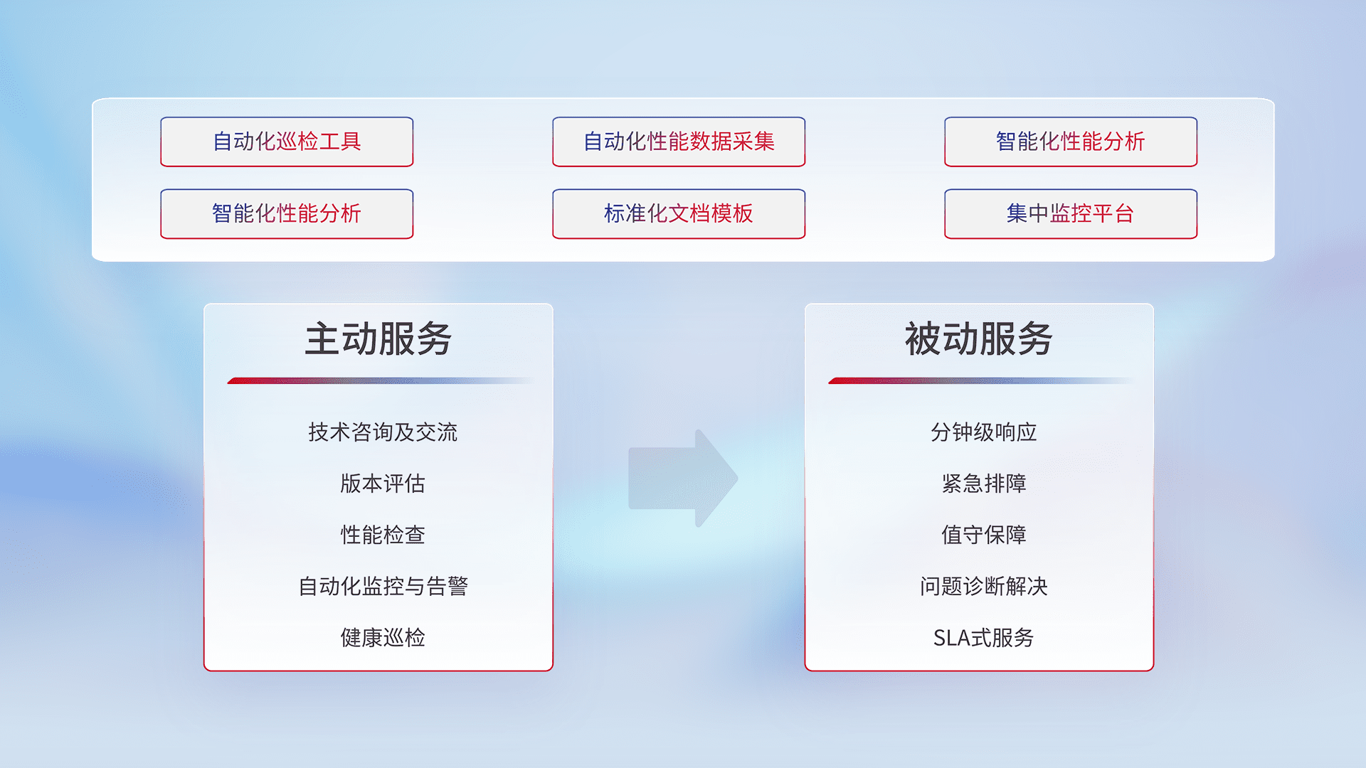 智能化工具和标准化文档,,,,保障服务质量,,,,提供主动服务(包含技术咨询、、、版本评估、、性能检查、、、自动化监控与告警、、健康巡检)和被动服务包含(分钟级响应、、、、紧急排障、、、值守保障、、、问题诊断解决、、SLA服务)。。。。